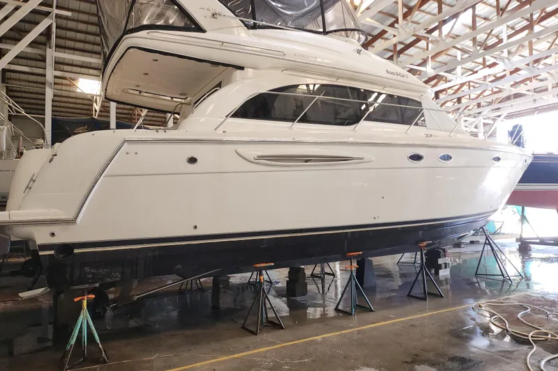Scare-D-Cat V has been lovingly maintained by her experienced owner since new. The 411 Meridian offers versatility and comfort. Cruise across the lake or take her on the Great Loop! She has the preferred Cummins 5.9DTA engines and a plethora of solid options making her the perfect choice for long range cruising or at the dock activities! Bow and stern thrusters with command control unit at helm. All the amenities needed for comfort and safety aboard.