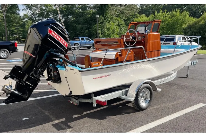 Manhasset 17 - A sophisticated center console yacht tender with a focus on elegance and refinement. Bringingback the classic Sakonnet and Nauset of the 1960's. It features a mahogany console and windshield (with louvered access door and stainless latch), Edson 3-spoke steering wheel, Ritchie 5" flush-mount compass, pleated helm seat cushions, under-seat fuel storage, courtesy LED lights, and classic chrome/bronze hardware (e.g., navigation lights, bow post, rubrail). The hull and deck use VE resin infusion, composite cores, and reinforced points for lifting. It emphasizes low-maintenance mahogany finished in Awlgrip, USCG-certified (2) 6-gallon fuel tank, Optima battery, and 10-year structural warranty.