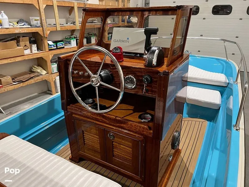 Step aboard the Manhasset 17, a classic center console tender with 1960s charm and modern reliability. Featuring a mahogany helm with Edson wheel, Ritchie compass, pleated cushions, and under-seat fuel storage, every detail blends elegance with performance.
