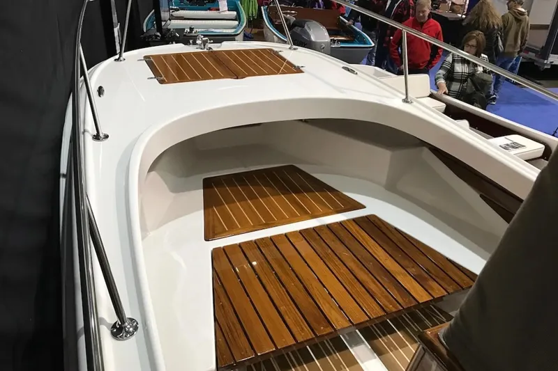 Pelham Bay 21 - Heritage Edition is the most traditional and luxurious option, featuring a teak/holly center console with stainless-framed Sunbrella windscreen, teak louvered doors, mahogany forward casting platform and gunnel slats with rod holders, teak helm seat with pleated cushion, forward deck hatch, and aft storage hatches. It emphasizes classic elegance with rich wood tones and refined details. Vacuum-infused resin (VE) hull and deck with composite stringers, cores, and reinforced components for strength and reduced weight.