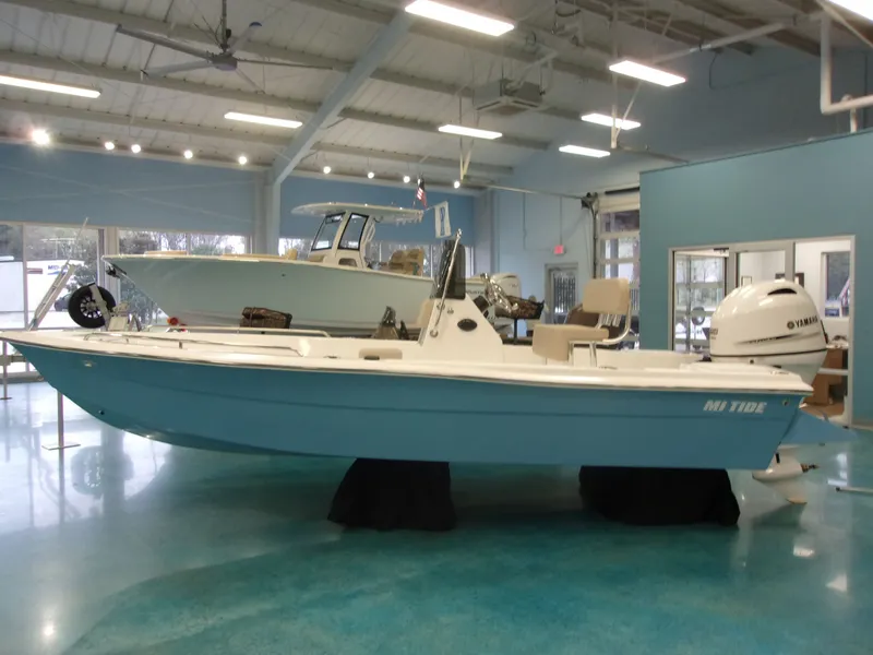 2026 Mi-Tide v1700 cc with white Yamaha F-90 LB2 and Wesco trailer. Factory options include a custom hull color, lean post w cushion, deluxe console, metal base plate and console live well!
