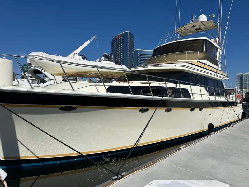 Here She Is! This is the one that won't let the "Big One" get away! Long Range West Coast Sportfisherman with almost 700 more gallons of fuel capacity (2,170) than the stock 1,500 gallons. That's not the only thing that dwarfs any comparable 64 footers. Her broad 19.5' beam translates into an oversized 3 ensuite stateroom interior layout with a tiered galley. A circular settee overlooking the salon and lanai level extends a few steps down to her 210 square foot cockpit. Heading up from the lanai, there is the custom glassed-in and air conditioned wrap-around helm featuring another comfortable settee. Even higher still, is the flying bridge which boasts the highest spot and the best view at the Marriott Marquis Marina in Downtown San Diego. With a possible slip transfer, the spectacular views of Downtown San Diego, Sea Port Village, San Diego Bay, and Coronado Island will be yours.