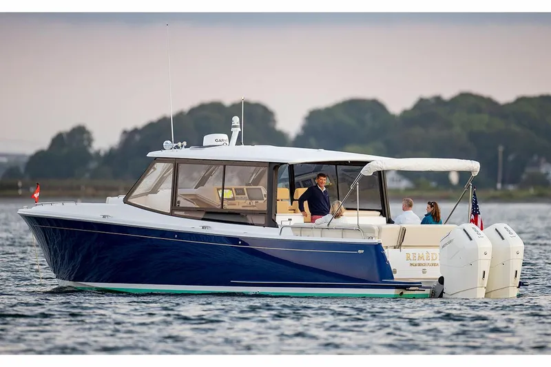 The MJM 4 stands out as a remarkable open-bow express day yacht with the added luxury of overnight accommodations. Owners rave about its unparalleled handling and smooth ride, dubbing it the "absolute best driving yacht" with effortless fingertip steering.