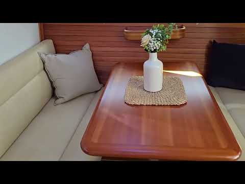 The salon has a dinette across from the galley with two athwartship settees and a cherry table that drops with an electronic control to make a 78" berth. An opaque linen curtain anchors to the ceiling to make this a private sleeping area; Large opening ports; Flat screen LED TV is mounted on angled bulkhead facing settee. Off-white Nevamar paneling with satin varnished cherry cabinetry doors and trim. Cabin sole is varnished teak and holly.