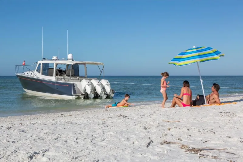 In its 43z, MJM Yachts offers the cruising comforts of its unique, high tech downeast designs along with the sporty handling, enhanced speed and shoal water versatility of outboard power. The launch of the 43z, and its sistership the 35z, represent the most advanced level of a and rapidly growing category of boat, the Outboard Express Cruiser. Boaters who now own outboard-powered center consoles, but are looking for more comfort underway and at anchor, can have both in MJM’s two entries. The 43z with triple outboards features speeds to 50 mph, go-anywhere shoal draft, responsive handling and low maintenance. And that is now paired with those features MJMs are noted for: all-weather cruising comfort in an offshore capable, quality-built yacht. The result? Going to the beach becomes a far more pleasurable weekend experience. Anchored bow out, engines up, with stern beach anchor, the 43z becomes a virtual beach cottage with all the comforts just a few feet from the sand.