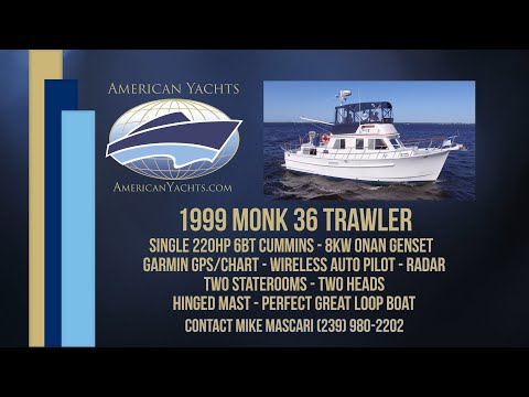 Monk 36 Classic aft cabin fiberglass trawler. The popularity of the Monk stems from her overall design and the execution by the dedicated craftsman in Nova Scotia. Designed by renowned naval architect Ed Monk. She features a walk around centerline queen berth in the master aft cabin. The aft head features a separate stand - up shower stall. On the exterior, the unobstructed flybridge provides a seating and entertainment area.