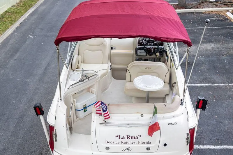 The 250 Cruiser packs more than you'd ever imagine into its 27 foot overall length. The integrated swim platform includes a recessed telescoping boarding ladder, wet storage and ski rope compartment. The removable ice chest, plentiful drink holders and a standard top with side and aft canvas are all standard equipment on this stylish pocket cruiser. Below deck, the 250 invites you and your guests with many of the comforts reserved only for larger craft. Forward, the dinette offers spacious seating and converts into a luxurious double berth. A mid-cabin with double berth completes the sleeping accommodations for four. On the port side is a one-piece molded fiberglass galley built for easy cleaning. It's complete with an AC/DC refrigerator, alcohol stove, sink with faucet, 12-volt direct/indirect lighting and generous storage compartments. Helm Station: Dash with full instrumentation. Adjustable helm seat allows driver to sit or stand in total comfort. Stereo remote control. Removable Transom Seat: Rear transom bench seat can be removed for added cockpit space for fishing or entertaining. Portside Cockpit Wet Bar: The cockpit houses a convenient wet bar with drink holders, sink, cooler and storage. Molded-in portside chaise lounge. Foredeck Sun Pad: Sun pad comes with convenient safety grab rails and drink holders is easily accessed via walk-thru windshield.