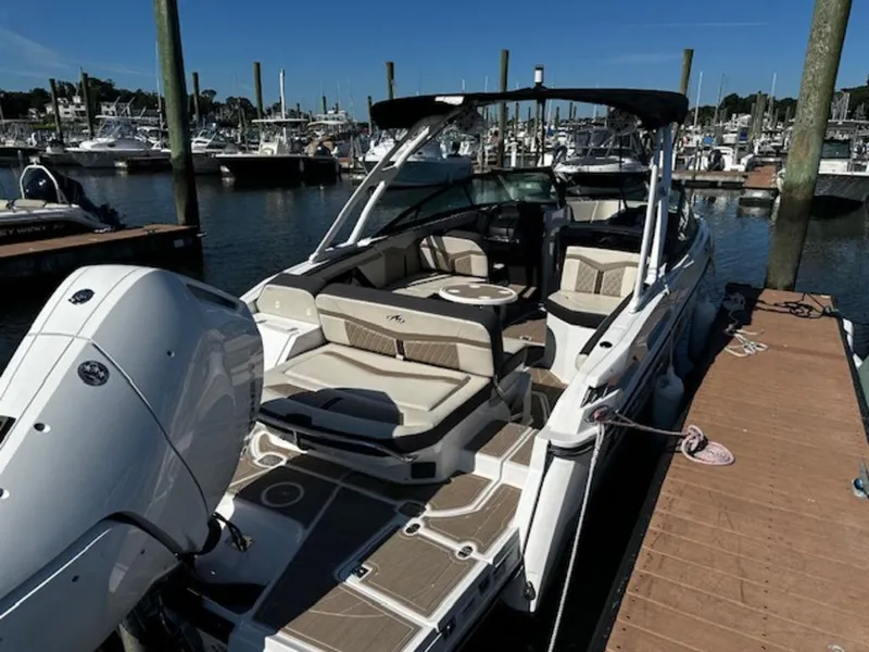 This 255ss was ordered with the following optional equipment- Mercury V10 350XXL Verado DTS outboard in the upgraded White color, Seadek inlay in cockpit and swim platform, Transom shower, Wakeboard tower, Bow and cockpit cover, Cockpit table, Simrad GPS/Chartplotter, Premium Helm seat, Stereo upgrade pkg w/Amp/Subwoofer, Stern mounted stereo remote, Cone speakers, Portside forward/aft facing lounger, Poup out toilet w/ deck fitting and Trim tabs w/ Indicators.