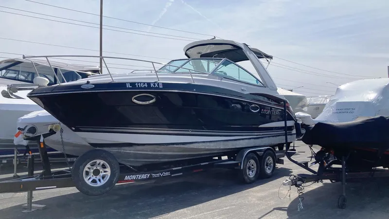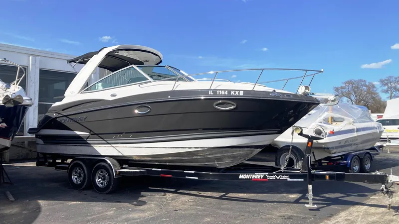 This boat is equipped with a Mercruiser 6.2L 300hp Bravo 3 engine (262 hours), Phoenix tandem axle trailer with brakes, polished fenders, spare tire, bimini top, cockpit cover, air/heat, fusion stereo system, electric stove, microwave, fridge, cockpit table, spotlight, trimtabs, keel guard, seadek in cockpit and swim platform, hot water heater and radar arch. This boat does not have camper enclosure.