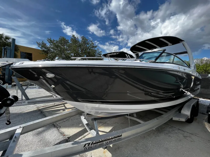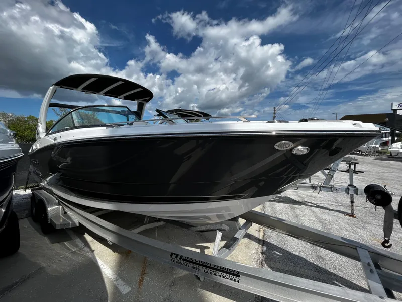 This new 2024 Monterey 275SS comes fully equipped with Mercury Verado 400XL, a sleek whisper gray hull sides color with an arctic ice hull bottom and matching arctic ice deck color. It also comes with Havana upholstery, windlass anchor, phender pro holders, swim platform, electric wakeboard tower, cockpit table with pedestal, drawer refrigerator, premium stereo upgrade package, transom shower, wet bar with solid surface insert, bow filler cushions, electric head, macerator with overboard discharge, Simrad GPS and chartplotter, bow and cockpit cover in onyx and many other great included features.