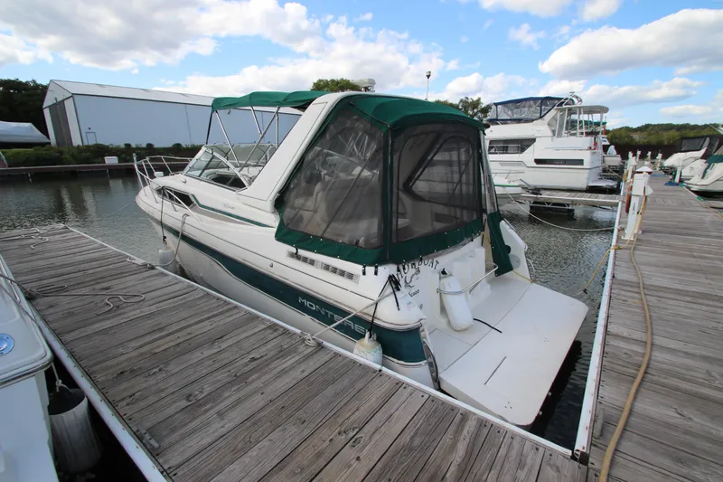PowerBoat guide had this to say; A well-styled cruiser by the standards of her day, the 296 Cruiser was Monterey's first entry into the highly competitive market for 30-foot sterndrive family weekenders. (Called the 286 Cruiser in 1993-94, the cockpit was revised in 1995 when she became the 296 Cruiser.) Hull construction is solid fiberglass, and her deep-V bottom provides a stable, comfortable ride in most weather conditions. The interior of the 296 is arranged in the usual fashion with double berths fore and aft, a convertible dinette, enclosed head and shower, and generous storage. Two bench seats in the midcabin provide seating, and between them is a fold-down table that converts the seats into the roomiest berth in the boat. Originally designed with a single helm chair, a double helm seat (with an aft-facing bench seat) became standard in 1995. Additional features include a walk-through windshield, a wide swim platform with fender racks, good main cabin headroom, a sport arch, and a molded bow platform. Among several sterndrive engine options, twin 250hp Mercruiser cruise in the high 20s and reach a top speed in excess of 40 knots. Note that the 140-gallon fuel capacity is pretty slim for a 29-foot boat.