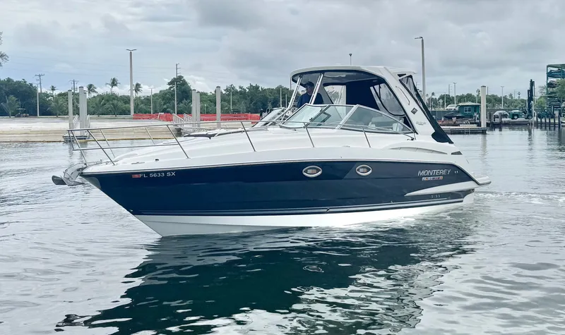 Below deck, the cabin is a testament to Monterey's commitment to luxury and functionality. The open and airy salon includes a well-appointed galley with a microwave, refrigerator, and solid-surface countertops. The forward V-berth and an aft cabin provide comfortable sleeping arrangements for four, making it perfect for weekend getaways.
