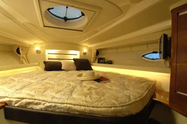 The Monterey 350 Sport Yacht is a seamless blend of performance, comfort, style and sophistication. The starboard refreshment center comes complete with full length stainless steel grab rail and convenient 120 volt outlet. The wetbar includes drink holders, sink with faucet, 48 quart cooler, ample storage and room for an optional refrigerator! The impressive above deck layout only hints at the sumptuous accommodations waiting below. A roomy salon welcomes you and the spacious galley is fully equipped. An exceptionally large head compartment with mirrored vanity, vacuflush toilet and a full stand up shower make you feel at home.