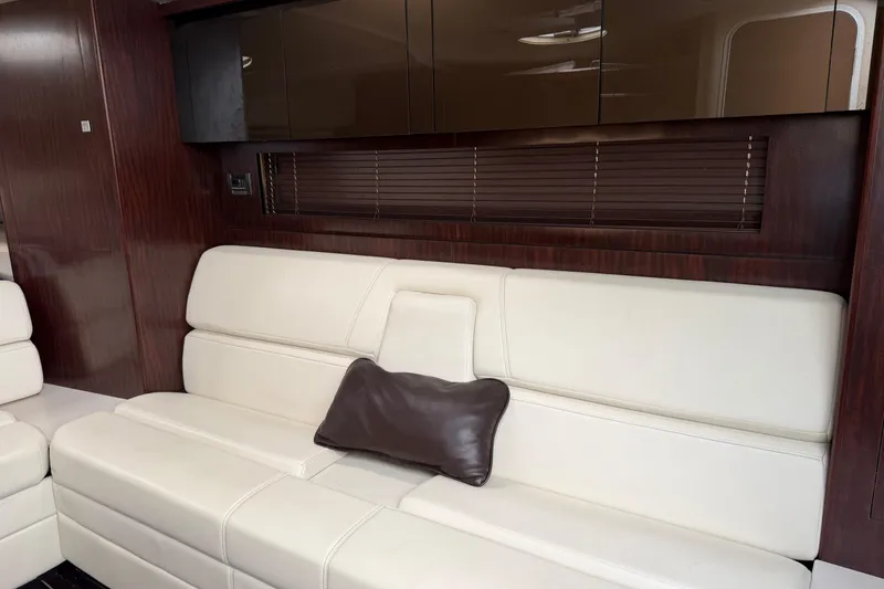 With her stylish lines and user-friendly layout, the Monterey 355 Sport Yacht is a top-shelf family cruiser with the right mix of comfort and performance. Thirty-something express boats have grown in popularity in recent years, and the 355 Sport Yacht was the largest boat in the Monterey fleet when she was introduced in 2007. Her open cockpit design comprises an aft lounge for three that has three different positions: a forward-facing seat, an aft-facing seat, and a two-person sun pad. A portside lounger is opposite the helm, and the deluxe wet bar includes a sink and refrigerator. While there are molded steps leading up the side decks, the best access to the foredeck is through the opening windshield. The sporty dash layout is a real attention-getter. Below decks, the 355's spacious interior is tastefully appointed with cherry mica joinery, premium galley appliances, Ultraleather seating, and synthetic wood flooring. A flat-screen TV is standard and fit and finish throughout the cabin is excellent.
