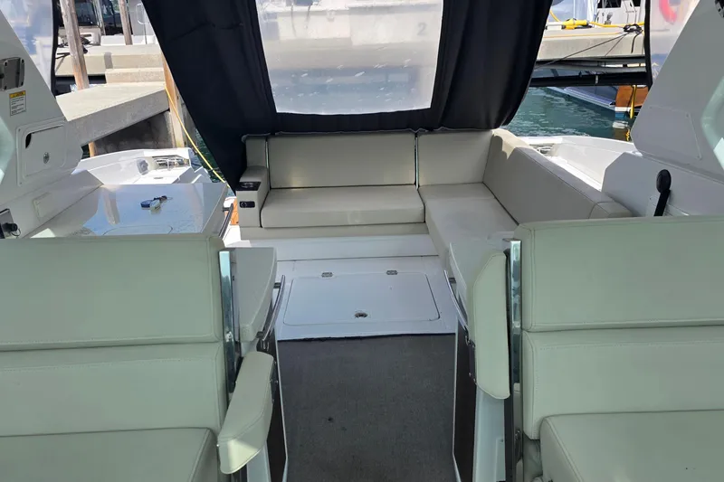 Adorned with cleverly designed seating, unlimited amenities and superior entertainment arrangements, both above and below deck, the 360SC is truly the first of its class. Our 360SC Coupe features a masterfully designed helm station with dual electric sliding helm/companion seats, dual wet bars, located both port and starboard, and an open seating area with L-lounge and cockpit table. Below deck a luxuriously appointed cabin awaits you with generous accommodations, featuring a spacious v-berth which converts from a comfortable bed to a dinette and seating area with solid wood table, and fully equipped galley. Beautiful full windows adorn the interior of the cabin allowing you to never miss a moment while underway.