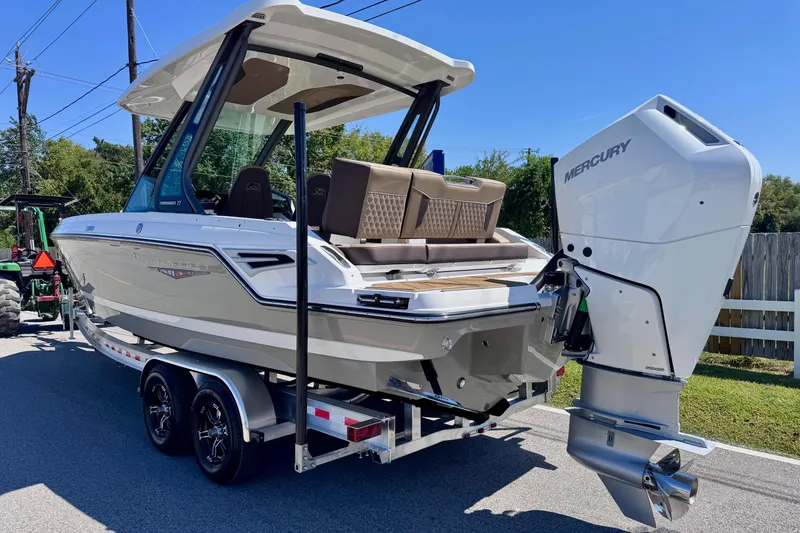 2026 Monterey Elite 27 OB being pushed by a Mercury 400XXL White Verado DTS and is sitting on a upgraded McClain Tandem Axle Heavy Duty Aluminum Trailer. Beautiful machine rigged with all Standard Features and the following Optional Upgrades: