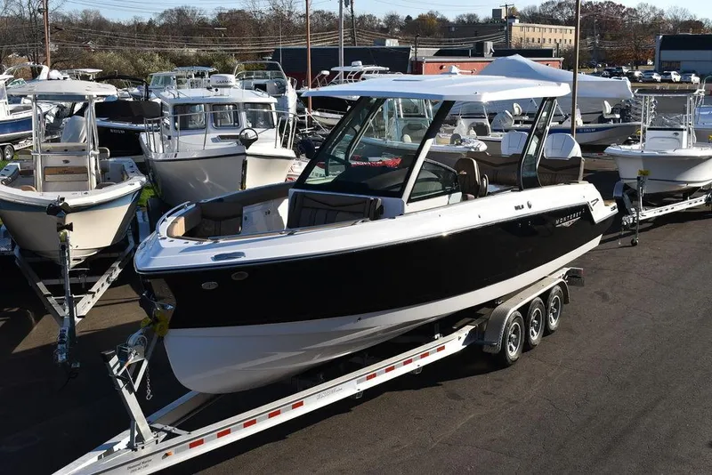 2025 Monterey Elite 30 Outboard Bowrider for sale by Diamond Marine. Options ordered with this boat includes Twin Mercury 300XXL White Verado DTS Outboards, Onyx (black) hull color, Windlass w/Stainless steel anchor/rope/and chain, Bow boarding ladder, Phender Pro fender clips, Seadek cockpit and swimplatform inlay, Aft Shade, Bow shade, Aft seat and bow cover, Console cover, Helm seat cover, Bow filler cushion.