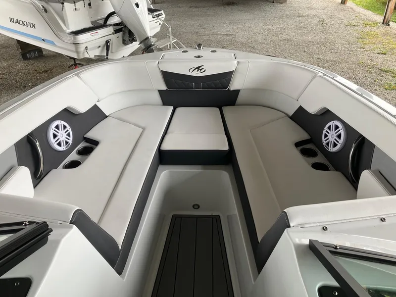 The cockpit area has been designed with a comfortable portside lounge, as well as arena seating offering you the perfect space to entertain or simply cruise in style. Dedicated storage compartments have been intentionally designed into the boat offering you the perfect locations to stow away your gear. A fiberglass dash with upholstered visor and medallion digital instrumentation finish out the hand crafted helm area.