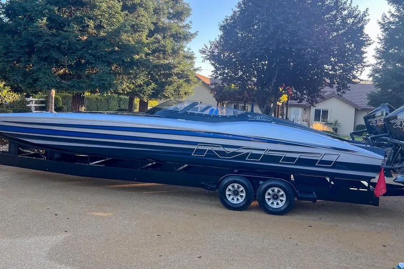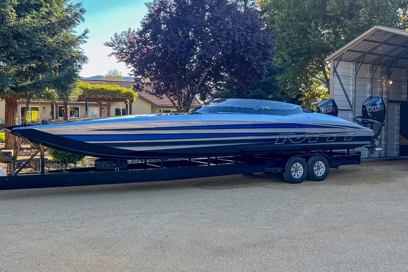 2019 MTI 340X featuring New interior, Seadek and Speakers done by Mayden Design in 2025. Mercury 450R's with approx 150 hours w/ Mercury Gold Warranty until 11/10/2027! Painted MYCO Aluminum Trailer included