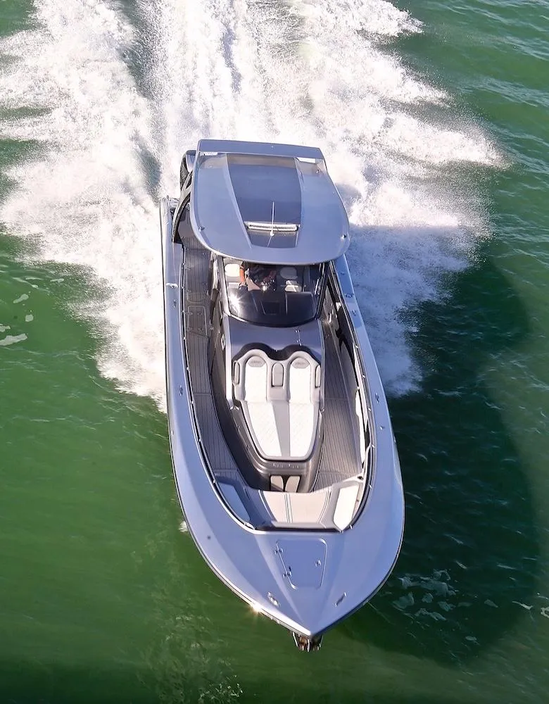 The boat is large in size and ride (42') but it feels extremely agile and sporty. The patented hull design is very efficient, not just in top speed but also in fuel burn at cruise (40mph @ 39gph, more than 1 mpg with quad Mercury 300 Verados) . This efficient design coupled with a 450 gallon fuel capacity yields excellent fuel range. 4x Mercury 350 Verado, Top Speed 75mph and cruising at 45-50mph burning 1mpg. 4x Mercury Racing 400R Top Speed 80mph cruising at 50mph burning 1mpg. 4x Mercury Racing 450R Top Speed 85mph cruising at 55mph.