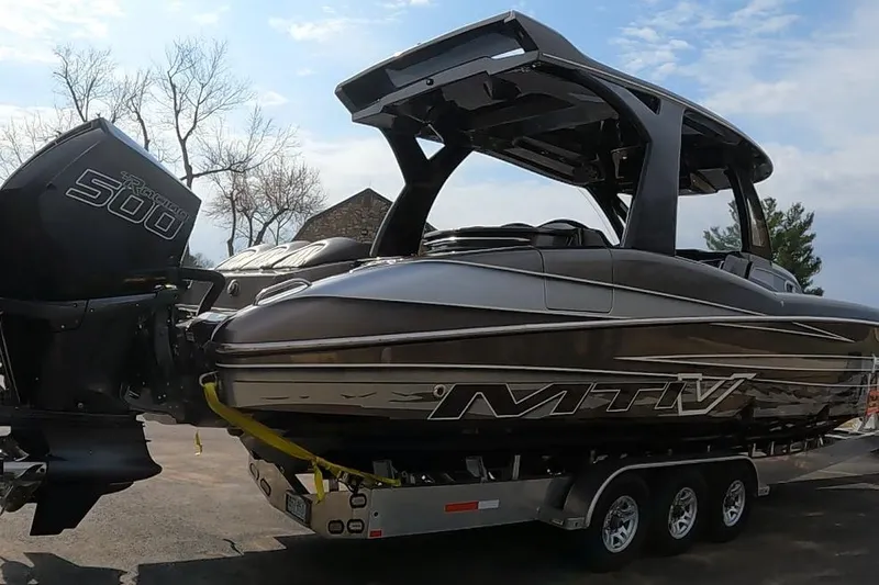 The 2018 MTI 42V (Slot-V) is a 42-foot high-performance luxury center console. Key features include a patented, stable "Slot V" hull design, a 6-seat cockpit arrangement, Garmin electronics, a large cabin with A/C, head, sink, refrigerator, & queen bed, and a spacious aft storage/lounge area.