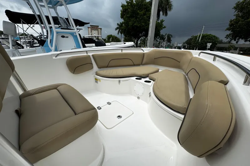 Extras: Includes 7-inch Simrad display, T-top with rocket launchers, leaning post with storage and footrest, removable coaming pads, dual battery with selector switch, on-board battery charger, bow cushion set, bow flip-out backrest, and more.