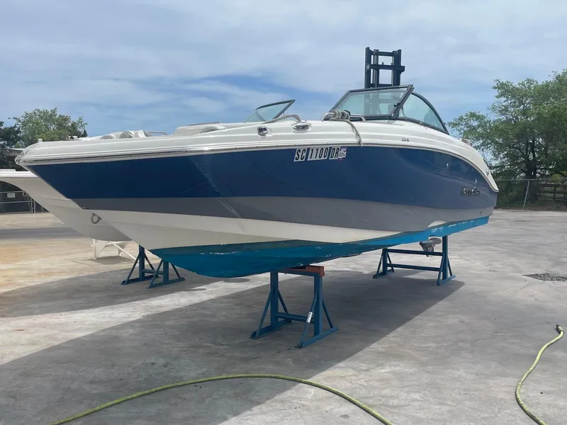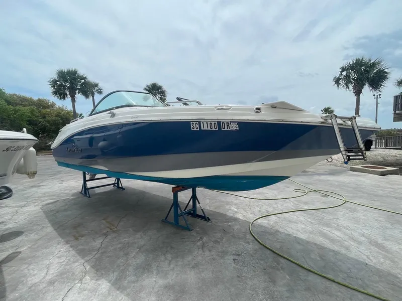 Whether serving up a family beach party or facing down gnarly weather conditions, the 223 Dual Console responds ably to any captain's command. Its rugged Deep Vee hull and U-shaped wraparound cockpit ensure a comfortable a ride for everyone. A panoramic walk-through windshield, enclosed dressing room, leather touch upholstery and Infinity® stereo system are just a few of its creature comforts. A Seadek transom landing and forward and aft boarding ladders extend the fun beyond the boat. Take it up a notch with the optional fishing package, which includes a live bait well and fishing seat.