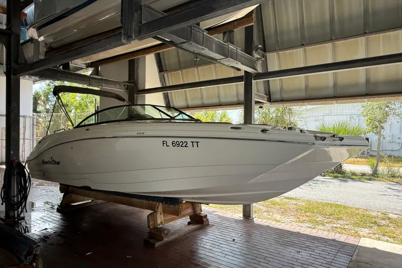FROM FACTORY: The 243 DC is the perfect combination of size and functionality. It offers an enclosed, step-down dressing room with optional portable head; wraparound seating in the cockpit; and a pressurized water system that services the galley with an optional transom shower. Plush seating bolsters the cockpit and bow with a transitional sun pad and easy-locking storage. Two bucket seats at the helm make way to the panoramic walkthrough windshield. Bow and transom landings offer access to the water for swimming and diving.