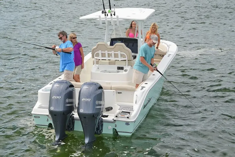 Versatile Design: Designed for both fishing and cruising, it includes fishing amenities such as rod holders and live wells, alongside comfortable lounging areas.
