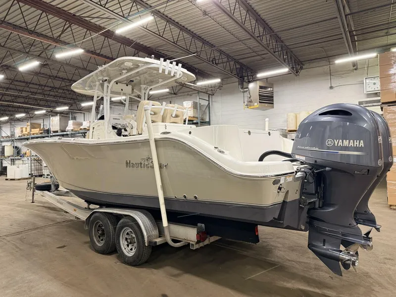 Introducing the 2018 NauticStar 28 XS, a remarkable center console boat designed for both performance and comfort. With an overall length of 28.3 feet, this vessel boasts a sleek fiberglass hull featuring a deep Vee shape, ensuring a smooth ride even in choppy waters. Powered by twin Yamaha outboard