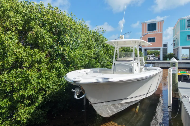 The 28XS is 28'4" long and 9'8" wide center console. The hull design is 21 degrees deadrise at the transom for stability at rest and 50 degrees at the bow providing a soft ride in rougher waters. The extreme bow flair allows for more comfort and displaces the water away from the passengers. The hull also has a reverse chine that helps the boat plane quickly, giving it more lift for a high and dry ride.