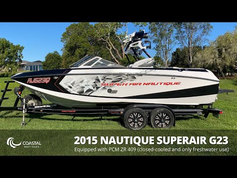 2015 Nautique G23, 2015 Nautique G23 •Length: 23 ft Beam: 102 in Dry Weight: 5,400 lbs Seating Capacity: 16 Performance and engine Engine: PCM 6.0L ZR450 (409 HP) Ballast: Integrated system with approximately 2,980 lbs capacity Cruise Control: Zero Off GPS Cruise Control Hull: Nautique G-Series Wake Hull Features Helm: LINC Digital Helm Command Center with a premium touchscreen Surf System: Nautique Surf System (NSS) with wave-shaping plates Stereo: JL Audio system with tower speakers, subwoofer, and zone control Lighting: LED courtesy and underwater lights Flooring: SeaDek non-skid decking Comfort: Heater package, heated seats, and a reversible rear-facing seat Storage: In-floor cooler, transom cooler, and numerous storage compartments