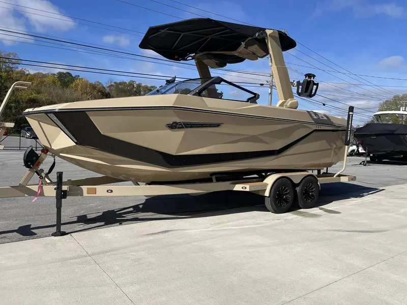 2025 Nautique G23, Boat Model Presenting the 2025 edition of the prestigious Super Air Nautique G23, a masterpiece in the world of boating. Powerful Engine Details Beneath the hull lies a high-performance ZZ6 450HP 6.2L Direct Injection Engine promising unmatched power and reliability. Quizessential Tower Accessories This elite boat features a premium Telescoping Flight Control Tower System and a pre-installed Tower Prep Kit JL Audio M Series Studio for the ultimate sound experience (pre-wired 8 channel amp). Supported Navigation Maps You'll never lose your way with its US and Canada supported navigation maps; explore the seas with ease. Battery System Stay powered up on all your adventures with the battery maintenance system 110, featuring an integrated dual battery charger. Protective Cover Types This boat comes with a platform cover and a tower down telescoping tower towable/mooring with anti-pooling for taking care of the boat. Luxury Additional Features Top off your boating experience with 1,200 lbs supplemental ballast, heater with defroster, platform access ladder, enhanced courtesy lighting package, underwater lights, Navionics maps in LINC Panoray, Nautique integrated steering assist, a convenient set of 2 pillows, a leather tandem spoke steering wheel, and magnetic wireless chargers in pockets and glovebox. Comfortable Seating Options The Super Air Nautique G23 is built for relaxation with retractable bow armrests and sumptuous bow filler cushions for ultimate comfort. Premium Stereo System Enjoy high-quality sound with the JL Audio M6 Series Studio Elite, featuring Wavefront technology and a handy transom mounted remote control. Also includes a smoked acrylic walk-thru air-dam pocket door. Elegant Boat Coloring The boat's dramatic coloring features a black chrome finish with illusion frost Chromeax badging. The interior deck is mystic white, and the accent colors are Sahara Sand and Centennial Black Metal Flake. The rear accent, hull bottom, FCT color, and platform color match in a cohesive Sahara Sand theme. The interior is done up in a Sahara Sand primary color, Jet Black Trueweave stripe, and seat boxing color, inclusive of black chrome finished Interior Chromax Badging. Even its non-skid color is mocha brown. The interior thread and acrylic colors are stylishly black, adding a touch of sophistication to the interior.
