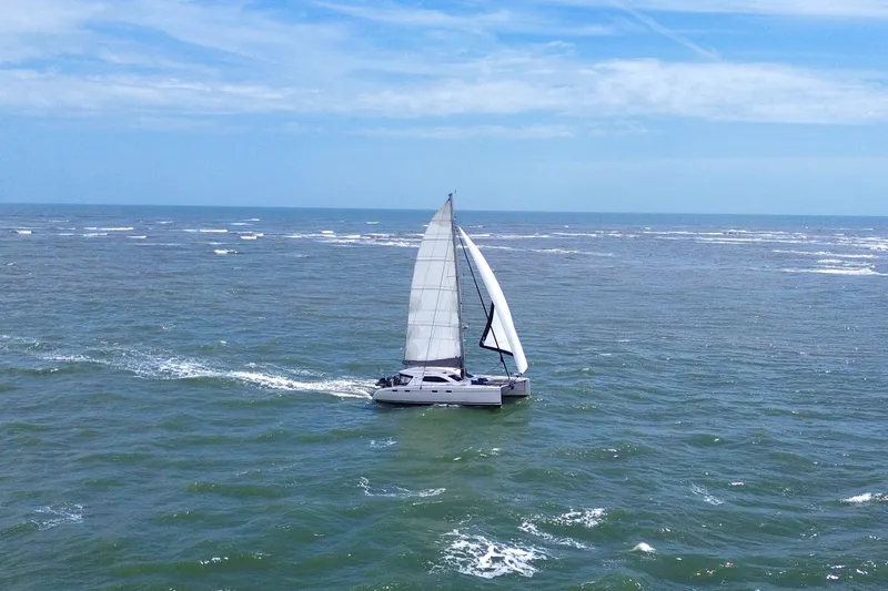 The Nautitech 47 remains one of the most respected performance cruising catamarans of her era. With a limited production run of roughly 38 hulls, she was designed for sailors who wanted real speed without surrendering livability. Her raised dual helm stations deliver an immersive connection to wind and water that flybridge designs simply cannot replicate, while the absence of a flybridge allows for a taller, more powerful sailplan set lower for stability. Below decks, the 47's fit and finish-solid woodwork, a U-shaped galley, and a panoramic salon bathed in natural light-stands in sharp contrast to charter oriented interiors of many newer production cats.
