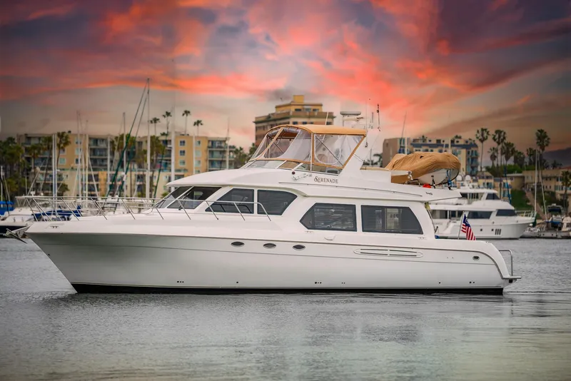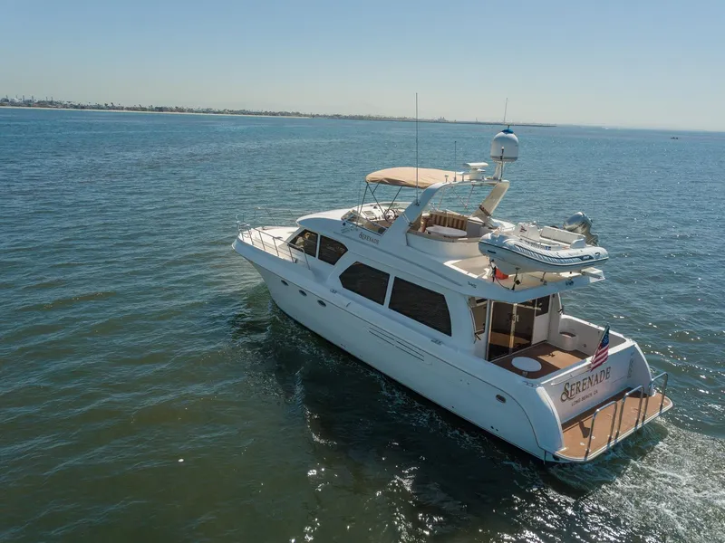 The Navigator 5100 is the ideal Yacht for family and friends to spend quality time at sea. With her two stateroom ensuites, your guests will fell like royalty. Enter the salon via the two Stainless Steel sliding glass doors from the covered overhead cockpit. The salon features a fold out sofa to starboard with cherry wood table, barrel chair w/ ottoman to port where the entertainment center is located. Her large u-shaped galley to port features 14 cu. ft. Liebherr Fridg/Freezer, three burner Princess propane stove/oven, double S/S sink, Corian counters, engine room access and as much storage of a vessel twice her size. Up three steps and you are in the pilot house, which features u-shaped dinette to port and enough electronics to keep the captain happy at sea. The flybridge is five more steps going aft. Serenade's flybridge is definitely the place to be at any anchorage, featuring captain's helm seat, Sunbrella covered L-shaped dinette w/ table to port, Princess BBQ, U-Line refer to starboard and Brower electric davit for AB RIB aft. Off the bridge and back through the pilot house one enters the stair way to the two large staterooms that would rival any yacht of her size. Navigator yachts have one of the most spacious engine rooms, uncluttered and open, you can easily see your machinery at a quick glance. Serenade's foredeck is wide open with her S/S rails w/ built in fender holders offering easy access to docking and or anchoring. All the way aft in the cockpit you have engine room access and transom door to starboard and one step down to a large built in swim-step.
