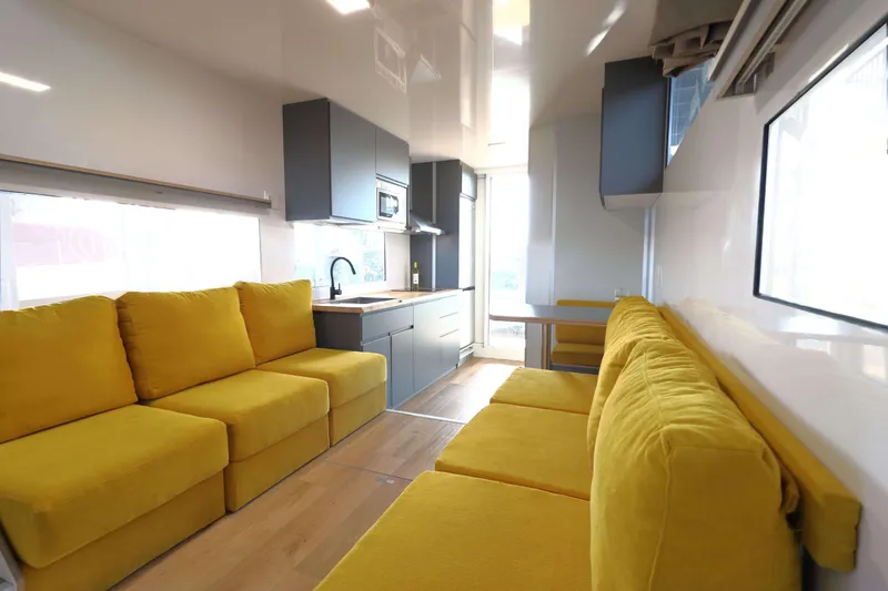 The interior features a thoughtfully designed layout with dedicated living, sleeping, and dining spaces, providing a bright, open feel throughout. Large windows bring in natural light and water views, while modern finishes create a clean, contemporary aesthetic. The galley is fully equipped for extended stays, and the sleeping accommodations are comfortable and private.