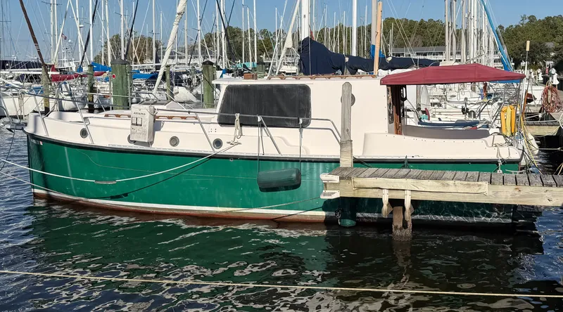 "pocket cruiser" is the ideal vessel for exploring both coastal waterways and inland lakes while offering a trawler's comfort. Designed by Ted Brewer with a shallow 3-foot draft and low bridge clearance, this rugged and sturdy fiberglass boat provides access to areas larger vessels can't reach. The cozy interior features a full galley, enclosed head, and a comfortable forward V-berth, making it suitable for living aboard, weekend getaways, or extended cruising. With its fuel-efficient cruising speed of 8 knots, bow thruster, autopilot, electronics suite and the ability to be easily trailered on its included triple-axle trailer, AMBIT is a fantastic and rare opportunity for a new owner to embark on their next adventure, such as the Great Loop.