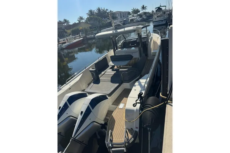 The lounge area has three sofas and a large table which, depending on it's position, can function as a sun deck or a seating area that can either have all seats facing the direction of travel or alternatively facing one another. The outdoor kitchen has drawers for cutlery and tableware, a kitchen sink with hot water and space for a gas stove or electric grill. The large stowage space measures just over 2500 liters and boasts a hydraulic opening mechanism that is easily accessible from the after-deck. It has space for everything you could ever want to bring with you, whether that be SUPs, sea bobs, wakeboards and biscuits or simply an inflatable rubber boat. The bathing platform and the after-deck are ample and easily provide enough space for several people at the same time.