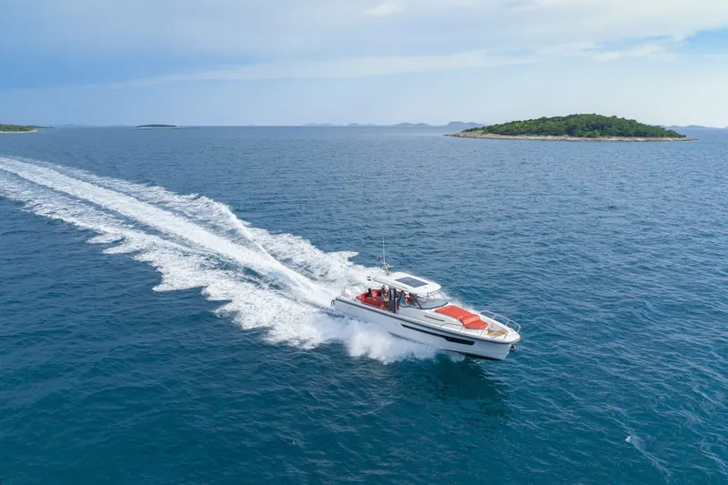 The lounge area has a large table and three sofas which, depending on their position, can function as a large sun pad or a seating area that can either have all seats facing forward or alternatively facing one another. The outdoor galley has drawers for cutlery and tableware, a kitchen sink with hot water and space for a gas stove or electric grill. The large stowage space measures just over 2500 liters and boasts a hydraulic opening mechanism that is easily accessible from the aft deck. It has space for everything you could ever want to bring with you, whether that be SUPs, sea bobs, wakeboards or simply an inflatable rubber boat. The swim platform and the aft deck are large and easily provide enough space for several people at the same time.