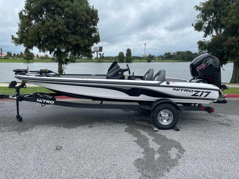 The NITRO® Z17 offers smooth, economical performance in a nimble size that's easy to tow, stow, and own. Reliable power from a FourStroke Mercury® outboard stands by to ramp up the fun with the jab of the throttle, while the NITRO® NVT™ hull offers quick planing and acceleration with on-rails handling at speed. The wide beam offers room for multiple anglers, stability in all conditions, and a world of storage beneath the decks. Lockable rod lockers carry sticks up to 7'6", while dedicated tackle stows in the rear deck keep boxes organized, dry, and readily accessible. The helm features a standard Lowrance® fishfinder, a full gauge set, and reliable switching for maximum convenience. Underneath the Z17 is a custom-fitted trailer made just for the hull it's carrying that promises years of smooth and hassle-free trailering. The Z17 is the perfect value- and feature-packed package that won't break the bank, but help you put checks in it.