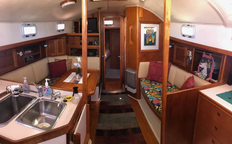 The "U" shaped galley sits to port of companionway. With ample working counter space and storage area. Great for working underway or on the hook.