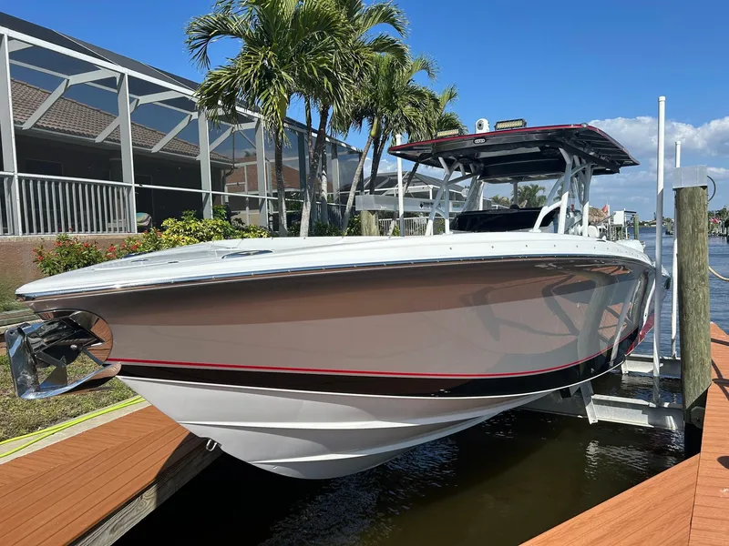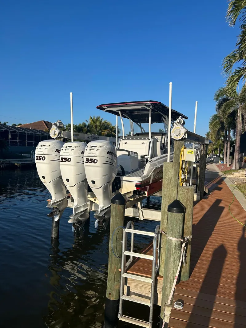 This was a big build list. Well kept with new interior recently. Triple Mercury 350 Verados with custom paint, air conditioning, full cover, flush toilet, upgraded wheel, bow table/lounge, twin Garmin GPS, autopilot, FLIR, twin LED Lighters, custom paint, JL Audio sound and more. Coming in on trade as new Nor-Tech build is on the way. Yours for only $314,900.