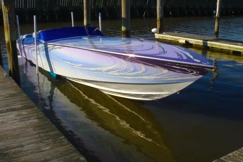 The boat features a unique custom paint job done by Chris Dilling of Grafic EFX who is a legend in creative boat design. This is not a WRAP but a 100% airbrushed design employing both metallic, pearlescent, as well as conventional paint. It took 32 days to paint.