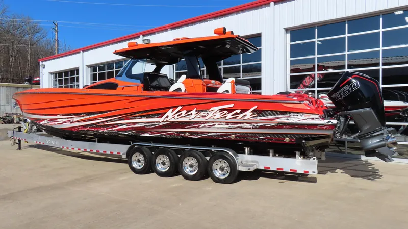 2023 Nor-Tech 450CC, Quad Mercury racing 450R with 90 Hours, Mercury DTS controls, Mercury vessel view 903, Coast key Remote engine start system, Triple Garmin 8616 16", Sea Keeper 6 Gyro, Custom paint and Graphics matching sliding cooler, Wind doors, Cabin AC, Over sized berth, Faux Teak flooring, Electronic controlled privacy glass, Enclosed head Elec. flush with shower, Apple TV, 50" LED light bar, Side dive door, FLMR MD324, Electric bow pedestal table, Garmin Auto pilot GHP 20, GSD 26 CHIRP sonar, Cockpit RGB LED, Radar, Remote spotlight, VHF Radio, XM Radio and weather, JL Premium Sound, Bar with cold plate, Bow and Stern thruster, Power retractable T top sun screen, Seadek, Telescoping dive ladder, Windlass anchor, Windshield wiper, 1KW Transducer, Diesel generator, Includes Evolution trailer