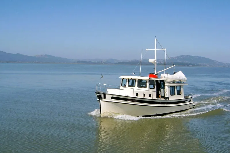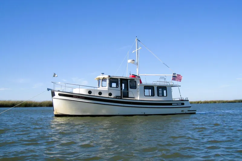 The 37 is a two-stateroom vessel with a single head with a stall shower. The master is Island berth forward, and twin bunks amidships opposite the head in the companionway. Designed by Lynn Senour, the originator of the Nordic Tug design, the 37 shares many of the features found in her larger and smaller siblings such as a hand-laid fiberglass hull with hard chine and full keel as well as the same attributes of speed and seakeeping qualities. The waterline length of the 37 is actually 39 feet due to a molded-in swim step that is essentially an extension of the hull giving her greater speed, stability and fuel economy. The design performs best at 8.2 knots burning just 2.2 GPH at 1400 rpm. Slow things down to 1350 rpm for an even 8 knot cruise at 2 GPH. As the sea state deteriorates, advance the throttle to improve stability and dampen the roll. At 2400 rpm setting will allow a 13 knot high continuous cruise speed with a stop speed of 16 knots. While many trawler designs must wallow through a sloppy sea state, the Nordic Tug hull form develops a surprising amount of stability at higher speeds. This feature allows her owners to operate with greater comfort and confidence in a wider range of weather conditions.