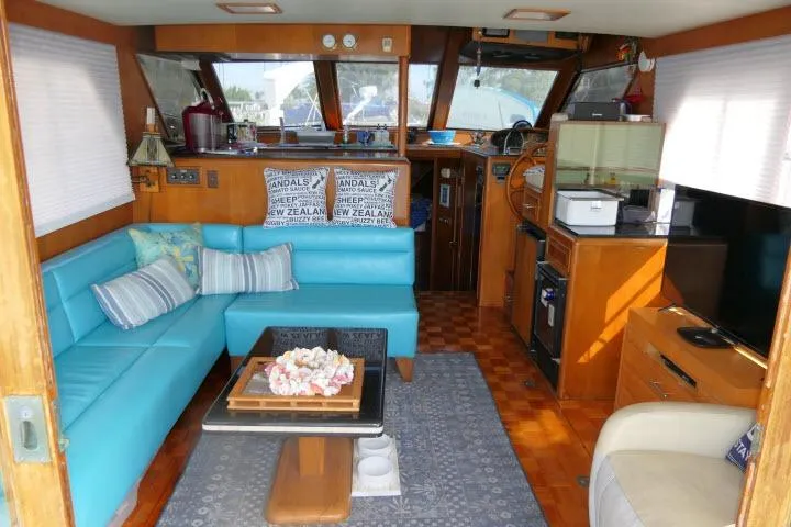 Entering via sliding doors from cockpit is a spacious salon with L-shaped settee and teak table to port and a lounge chair and entertainment center with a 40” color TV to starboard. Forward of the entertainment center is an icemaker, refrigeration and the lower helm station. To port of the helm station is a very functional U-shaped galley.