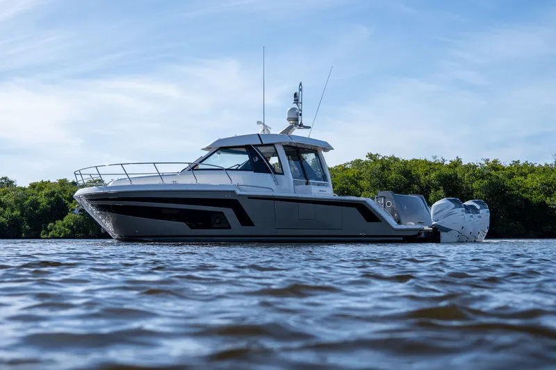Step aboard the magnificent 2021 Ocean Alexander 45 Divergence Coupe, a true gem on the water with its striking Alexseal metallic paint in Stardust Silver and a matching painted molded mast. Powered by four white Mercury Verado 400hp engines with joystick piloting control, with extend warranty 01/14/2024 - 01/14/2028 MPP PLAT. This vessel offers exhilarating adventures. Enjoy a smooth and stable ride thanks to the Seakeeper 6 stabilizer. This luxurious boat boasts top-of-the-line features, including an entertainment package in both the pilothouse and aft stateroom, a bow thruster with joystick helm station for easy maneuvering, custom stone flooring in the head, upgraded walnut wood flooring, an outdoor galley equipped with a Kenyon grill, privacy covers for tranquil moments at sea, and a newly installed Starlink system. Recently subjected to a comprehensive inspection and survey with all necessary maintenance completed, this yacht is ready for uncompromised voyages. Make a statement on the water and relish every second aboard this exceptional vessel.