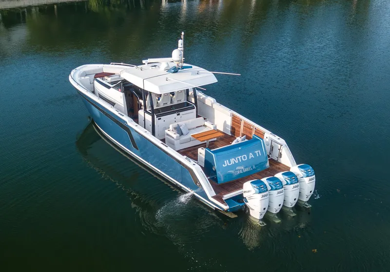 When stepping on the boat, you are met with a big transom area and a large aft storage locker facing the four, beautiful, 350HP Mercury Verados (all under 390hrs) painted to match the hull.