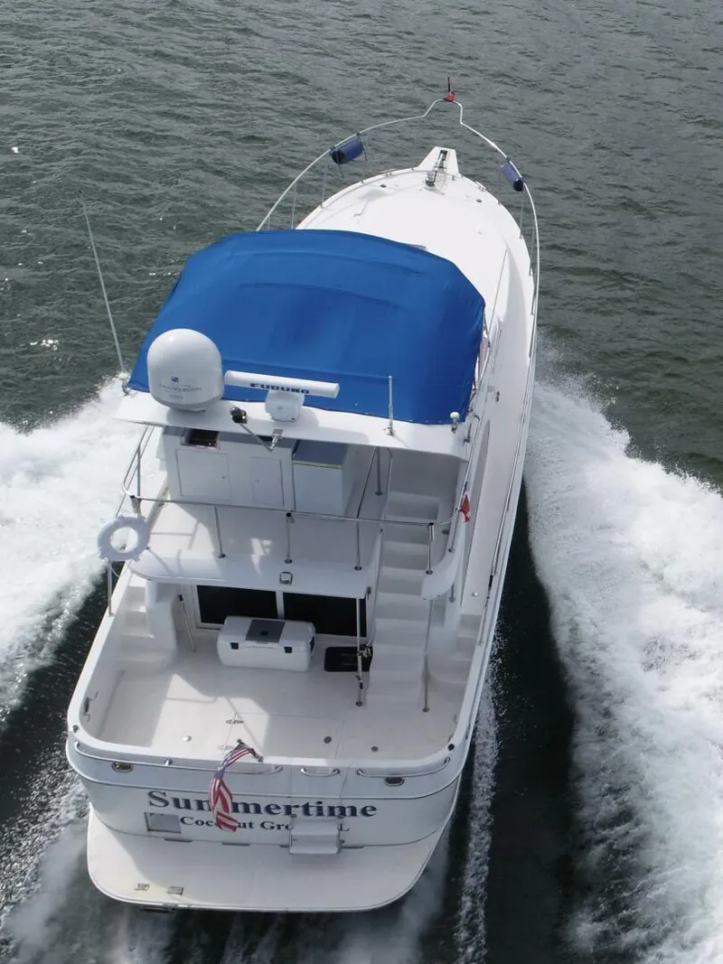Monk has left space in the cockpit for a table and chairs, and incorporated a transom door for access to the platform. The bridge includes a control station with helm and companion seating and a lounge area with a table. 'Summertime" has the wet bar with a refrigerator, sink and barbecue are optional ($3,960). Since there is no boat deck, carrying a tender will require a transom davit.