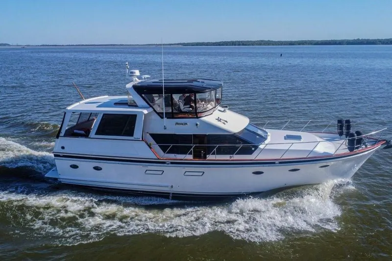 Panacea III is a 1989 48' Ocean Alexander sundeck motoryacht. She offers twin Caterpillar 3208 375 HP main engines, Westerbeke 12.5 kW generator, two Purasan blackwater treatment systems, huge sundeck, full-beam master stateroom aft, enclosed shower in each stateroom head and a lower helm with side deck access door. This fresh water boat is docked under cover and is Great Loop capable.